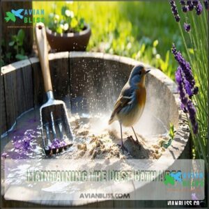First, keep an eye on cleanliness by sifting through the dust bath weekly to remove feathers, droppings, or debris. This keeps the area inviting and pest-free.