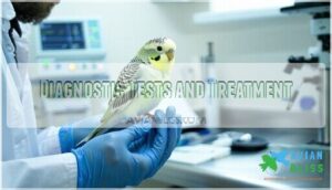 - Don’t use over-the-counter medications without veterinary guidance, as improper treatment can harm your bird—instead, focus on supportive care like proper humidity and warmth until professional help is available.