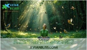You’ll recognize melodies by using apps like Merlin Bird ID or BirdNET that analyze sounds in real-time, even when birds remain hidden from view.