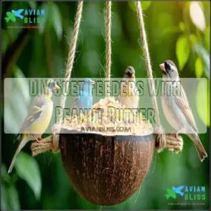 Use smooth, unsalted peanut butter as a suet alternative option. Spread it on a sturdy base, sprinkle seeds, and hang. It’s a quick DIY birdseed fix!