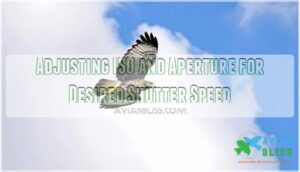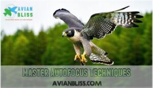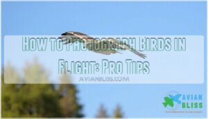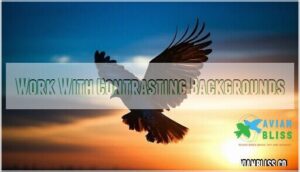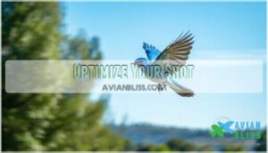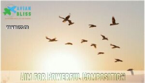 You’ll focus on freezing motion with fast shutter speeds, tracking movement precisely, and showcasing the dynamic beauty of birds during their natural flight behaviors, which involves dynamic beauty.