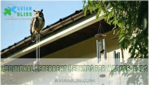 • Combine multiple deterrent methods for maximum effectiveness—pair visual deterrents with sound devices like wind chimes, eliminate insect attractants, and promptly repair existing damage to prevent further woodpecker problems.