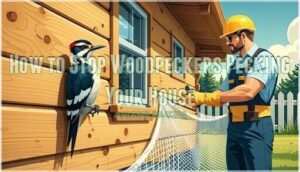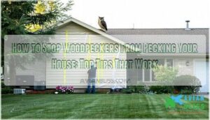 Hang bird netting if they’re persistent—it’s like putting up a “No Vacancy” sign. The key is persistence and blocking access. Stick around for ideas that’ll keep your home woodpecker-free without stress.