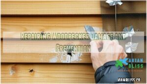 To fix woodpecker damage, you’ll need to fill holes with materials like wood putty and sand them smooth.