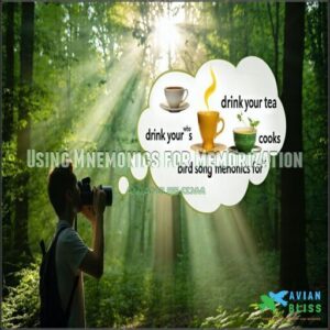 When memorizing bird songs, mnemonic devices transform complex sounds into unforgettable phrases. Your brain latches onto familiar words that mimic each species’ unique vocalizations, making recall improvement almost effortless during field identification.