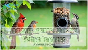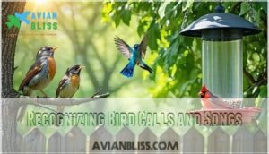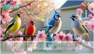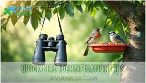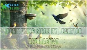 Watch feeding habits too—woodpeckers cling to tree trunks, while nuthatches walk headfirst down bark. These simple observation tricks will have you recognizing your feathered neighbors like a pro, and there are specific techniques that can boost your accuracy even faster.