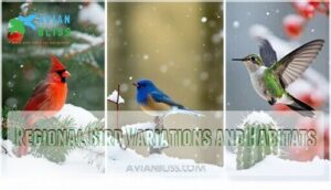 You’ll encounter diverse common bird species across America’s backyards, each adapted to specific regional conditions.