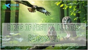 You’ll discover that Illinois’ birds of prey act like nature’s cleanup crew and population control specialists, keeping ecosystems balanced by hunting rodents, removing carrion, and controlling pest species.