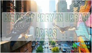 These avian predators tackle urban challenges head-on, from urban prey shifts to nesting site changes atop skyscrapers. Light pollution impact affects their hunting rhythms, while noise pollution effects force them to adjust communication.