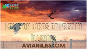 You’ll encounter three main groups of raptors soaring through Illinois skies: falcons that streak through the air like feathered missiles, majestic eagles fishing near waterways, and vultures cleaning up nature’s leftovers with their impressive wingspans.