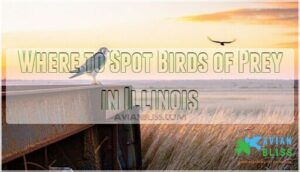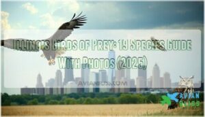- You’ll find 19 species of birds of prey throughout Illinois, from tiny American Kestrels to massive Bald Eagles with seven-foot wingspans, thriving in diverse habitats from Chicago’s skyscrapers to southern prairies.