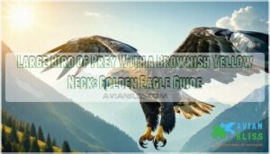 - You’ll recognize Golden Eagles by their impressive 6-7 foot wingspan and distinctive golden-brown head feathers contrasting with their dark brown bodies – they’re North America’s largest and most powerful raptor.