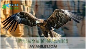 You’ll recognize a golden eagle by its impressive size, with a wingspan reaching up to 7.4 feet and a distinctive brownish-yellow head and neck that contrasts sharply with its dark brown body feathers.