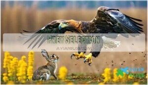 These skilled predators primarily target small mammals like rabbits, ground squirrels, and marmots using their powerful talons, though they’ll also consume birds, reptiles, fish, and carrion when opportunities arise, showcasing their adaptability as skilled predators.