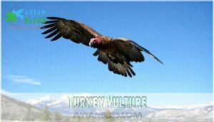 You’ll recognize turkey vultures by their distinctive red heads and impressive 6-foot wingspans as they soar effortlessly above Colorado’s landscapes from spring through fall.