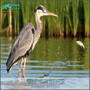 - Great blue herons using patient hunting strategies, standing frozen before striking with lightning speed