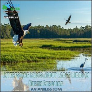 You’ll notice North Carolina’s large birds showcase impressive physical traits, from the bald eagle’s massive 8-foot wingspan to the great blue heron‘s statuesque 54-inch height.