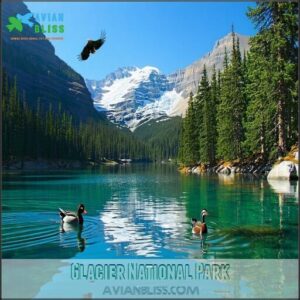 You’ll find Glacier bird species such as harlequin ducks and golden eagles thriving in alpine bird habitats. Ideal for birding hotspots mountains, this park’s trails vary in difficulty.
