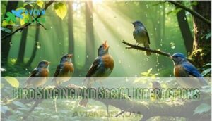 Songs also break down barriers in bird communication, showcasing strength or fitness. Singing behavior isn’t random; it’s a direct response to environmental challenges, not a sign of happiness, breaking common bird myths.