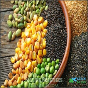 - You’ll support optimal pigeon health by providing a mix of seeds and grains (millet, barley, wheat, corn) that mirrors their natural diet, aiming for 12-14% protein content to maintain healthy plumage and immune function.