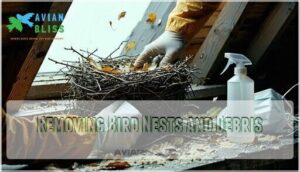 Clean nesting sites thoroughly with disinfectant to prevent future bird mite habitat development, ensuring you handle the process with safety procedures in mind.