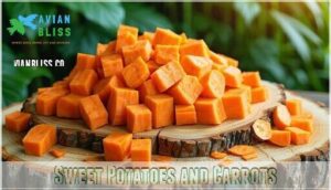 Dark leafy greens like kale and spinach pack vitamin A, while sweet potatoes and carrots deliver beta-carotene that converts to essential nutrients your bird needs.
