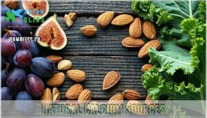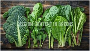 You’ll find that dark leafy greens pack more calcium punch per serving than most other natural food sources, with kale delivering 245 mg per 100 grams and collard greens providing 232 mg.