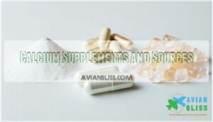 Calcium carbonate stands as the gold standard among calcium sources for birds, offering 40% elemental calcium content. You’ll find it in powdered, liquid, and block forms. Oyster shell provides natural calcium carbonate, while crushed egg shell offers familiar supplementation.