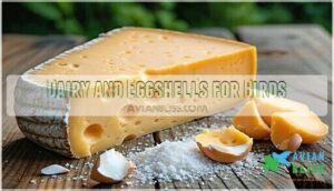 You’ll find vitamin D3 in egg yolks, fish, and liver – these D3 food sources work alongside sunlight exposure to boost calcium absorption in your bird’s body.