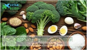 You’ll find that nature provides numerous calcium-rich foods that can meet your bird’s nutritional needs without relying on synthetic supplements.
