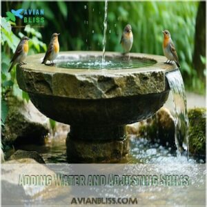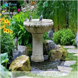 Once water levels are adjusted, focus on shim placement to guarantee your natural stone bird bath stays steady.