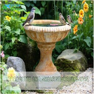 Materials like terracotta or shale offer earthy tones that blend seamlessly into outdoor spaces. Proper placement and leveling guarantee stability, while regular cleaning keeps your bird bath inviting.