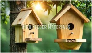 When you’re choosing materials for your bird feeder project, you’ll find that cedar and pine woods offer natural weather resistance and lightweight durability that plastic simply can’t match.