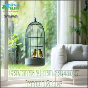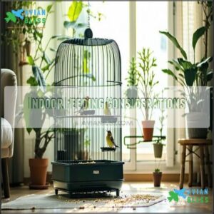 You’ll create a welcoming indoor space for your feathered friends by using specialized no-mess feeders and placing them strategically away from furniture and high-traffic areas.