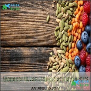 Checking ingredient lists is vital for avoiding artificial additives and allergenic ingredients. Quality bird food should be free from preservatives like ethoxyquin, BHT, and BHA. Zero-filler blends guarantee all components are nutritious and actually consumed, saving you money while supporting better bird health.
