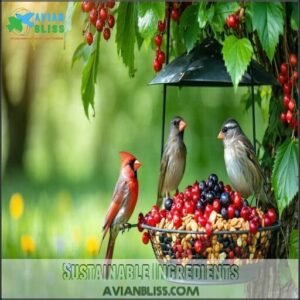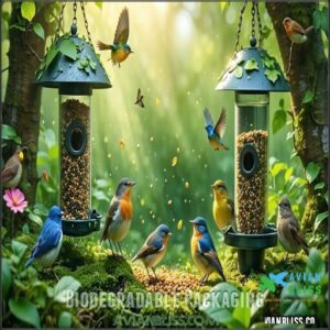 Biodegradable packaging guarantees minimal environmental impact, helping wildlife thrive, and many brands now offer sustainable packaging options, like recycled packaging, proving you can feed birds responsibly without harming their ecosystem.
