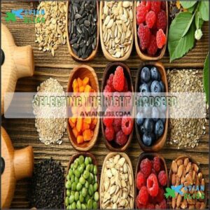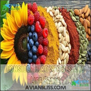 You’ll need to match your bird food selection to your feathered friend’s specific needs, considering factors like species, size, and life stage.