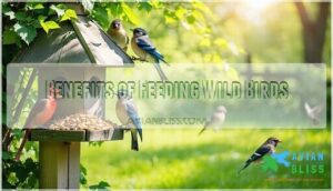 - You’ll want to provide wild birds with a balanced diet that mimics their natural feeding patterns, focusing on seeds, insects, and fruits that offer critical proteins, fats, and carbohydrates.