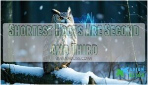 Recognizing Great Horned Owl calls becomes easier when you focus on hoot length ranking. Their distinctive pattern features the shortest sounds in positions two and three, creating a unique rhythm that sets them apart from other Ohio owls.