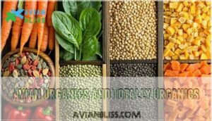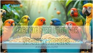 Organic bird food offers ingredient alternatives and texture preferences that’ll make even the most stubborn eaters happy. You can add supplement additions and flavor enhancers while using gradual introduction methods.