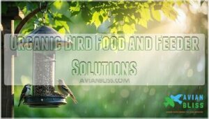 Smart feeder choices like squirrel-proof models and advanced pole systems protect your premium organic seeds while creating an efficient backyard feeding station, utilizing advanced pole systems.