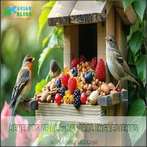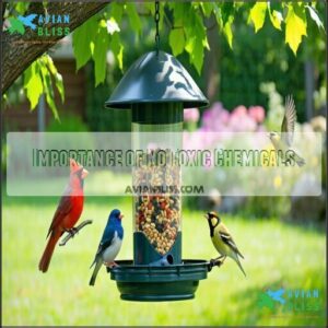 - You’ll reduce yard mess and deter squirrels by choosing organic bird food without sunflower seeds, as these alternative blends eliminate shell waste while still attracting diverse bird species.