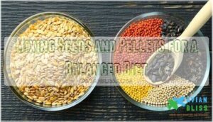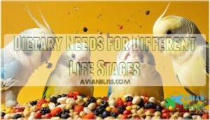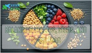 You’ll want to incorporate them alongside pellets (40%), vegetables (20%), and fruits (10%) for a balanced nutrition plan that keeps your feathered friend happy and healthy.