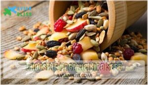 - When choosing organic bird seed, look for USDA-certified options that contain nutritious varieties like millet, safflower, and canary grass seed, which provide essential nutrients for your feathered friend’s overall well-being.