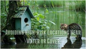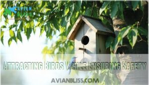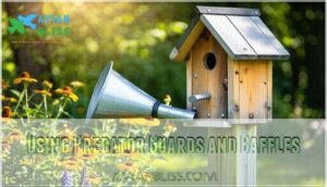 You’ll protect your birdhouse by installing metal baffles on poles, positioning it 10 feet from hiding spots, and avoiding perches that give predators easy access.