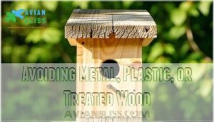 You’ll want to avoid metal, plastic, or treated wood for your birdhouse, as they can cause material overheating or toxin exposure.