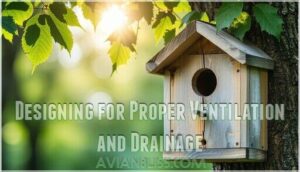 - You should choose safe materials for your birdhouse, like untreated cedar wood, and design it with proper ventilation and drainage to prevent overheating and moisture buildup.