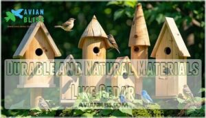 Cedar stands out as the gold standard for safe bird house materials. This natural material offers incredible cedar longevity—lasting decades without rotting. Unlike cheaper options, untreated wood like cedar breathes naturally and stays cool.