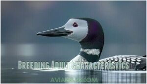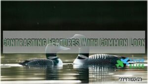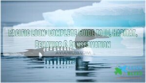 - You’ll identify Pacific loons by their sleek, torpedo-shaped bodies and distinctive black-and-white checkerboard backs during breeding season, plus their elegant gray heads that distinguish them from larger Common loons.