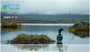 You’ll find these seabirds carefully selecting Nesting Sites with shallow water access for quick escapes. Both parents share Nest Construction duties, weaving aquatic plants into sturdy platforms.